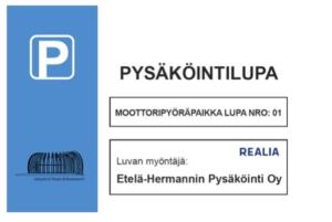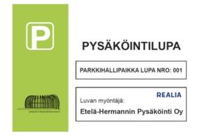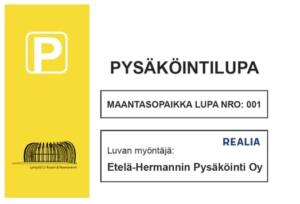 - Kaikissa pysäköintiluvissa tulee olla myöntäjänä REALIA ja Etelä-Hermannin Pysäköinti Oy.
